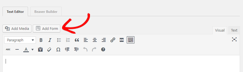 برای افزودن آن به یک پست یا صفحه ، یک صفحه / صفحه جدید ایجاد کنید (یا یک صفحه موجود را ویرایش کنید) و به سادگی بر روی دکمه Add Form در بالای نوار ابزار خود کلیک کنید.