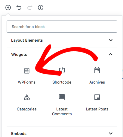 پس از باز کردن ویرایشگر پست یا صفحه ، با کلیک بر روی نماد + (به علاوه) در گوشه سمت چپ بالا ، یک بلوک WPForms جدید اضافه کنید.