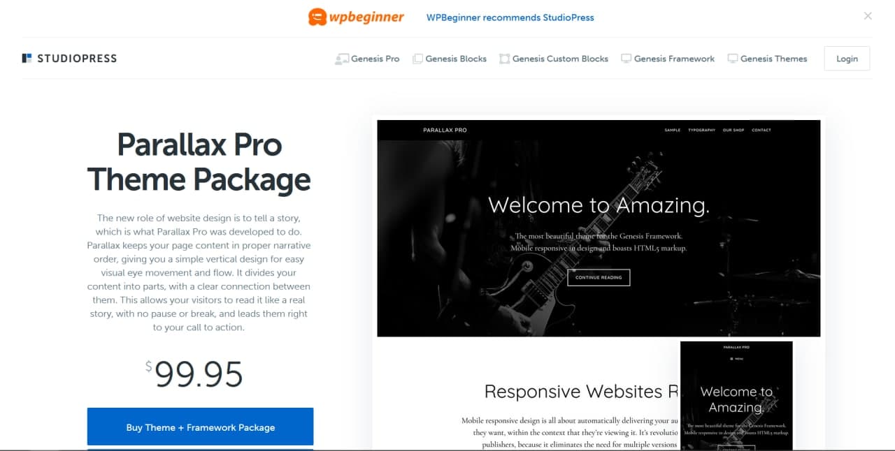 اگر عاشق طراحی های پیمایشی Parallaxهستید ، StudioPress Parallax Pro یک قالب عالی برای شماست. این یک قالب چند کاره خیره کننده و زیبا برای وردپرس است. این یک قالب است که بر اساس چارچوب قدرتمند Genesis ساخته شده است.