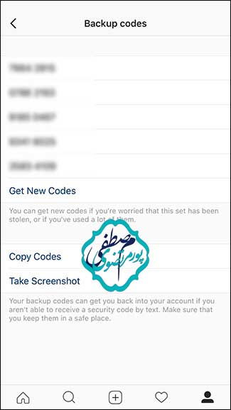 در صورتی که قادر به دریافت متن هنگام ورود به حساب اینستاگرام خود نیستید، پنج کد پشتیبان ( (Backupنیز دریافت می کنید. ما توصیه می کنیم از کدها اسکرین شات بگیرید تا بعداً به راحتی پیدا شوند. شما می توانید هر بار از یک کد برای ورود به حساب خود استفاده کنید.