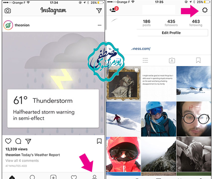 اینستاگرام تان را باز کنید و به پروفایل خود بروید. روی آیکون شکل چرخ دنده ( (Setting در قسمت بالا سمت راست برای دریافت صفحه “Options” ضربه بزنید.